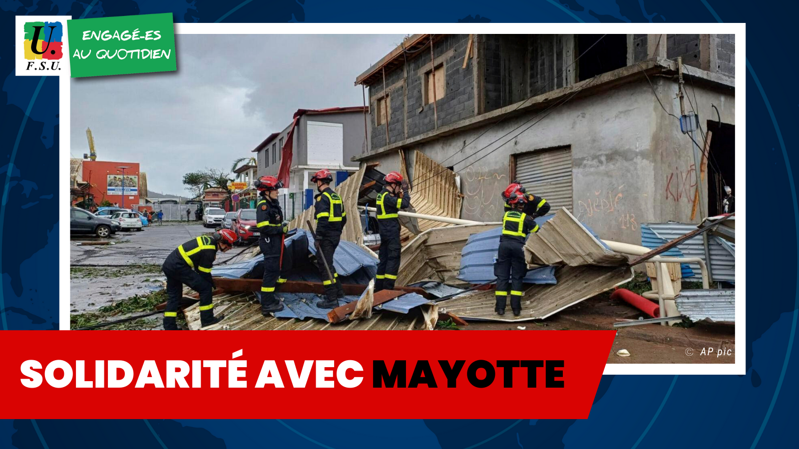 La FSU exprime sa solidarité avec Mayotte et apporte tout son soutien à l’ensemble de ses habitants. La FSU se mobilise avec Solidarité laïque pour engager une aide rapide aux Mahorais.